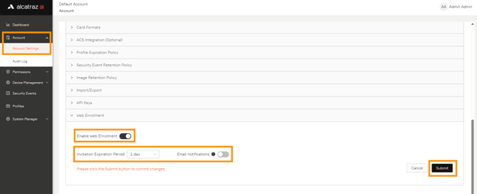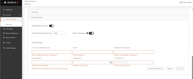 Enabling Web Enrollment and setting up SMTP for email notifications in the Alcatraz Admin Portal